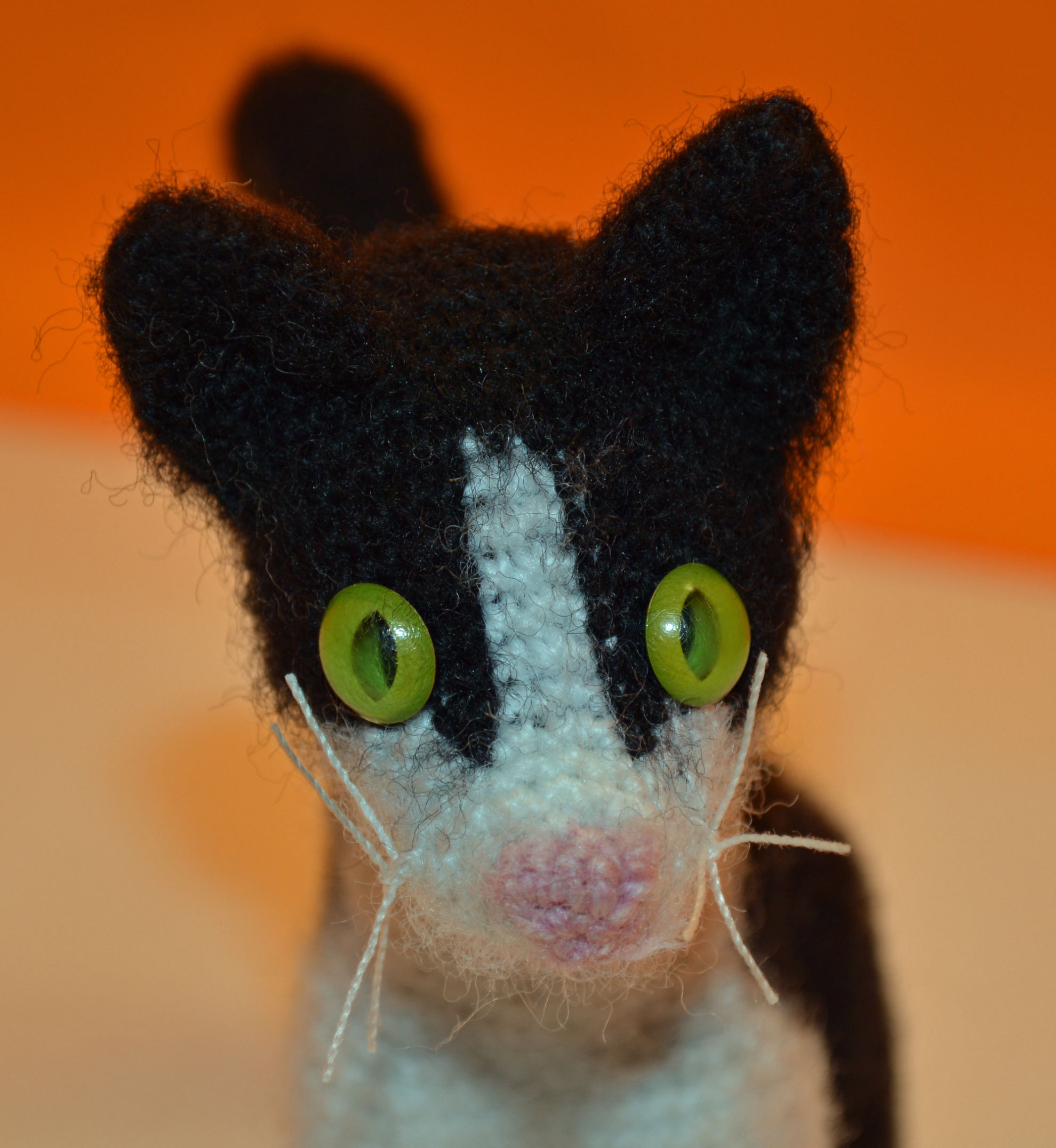 Material: Wolle Schwarz, Weiss, Rosa, Plastik Katzenaugen,                          Bastelwatte,