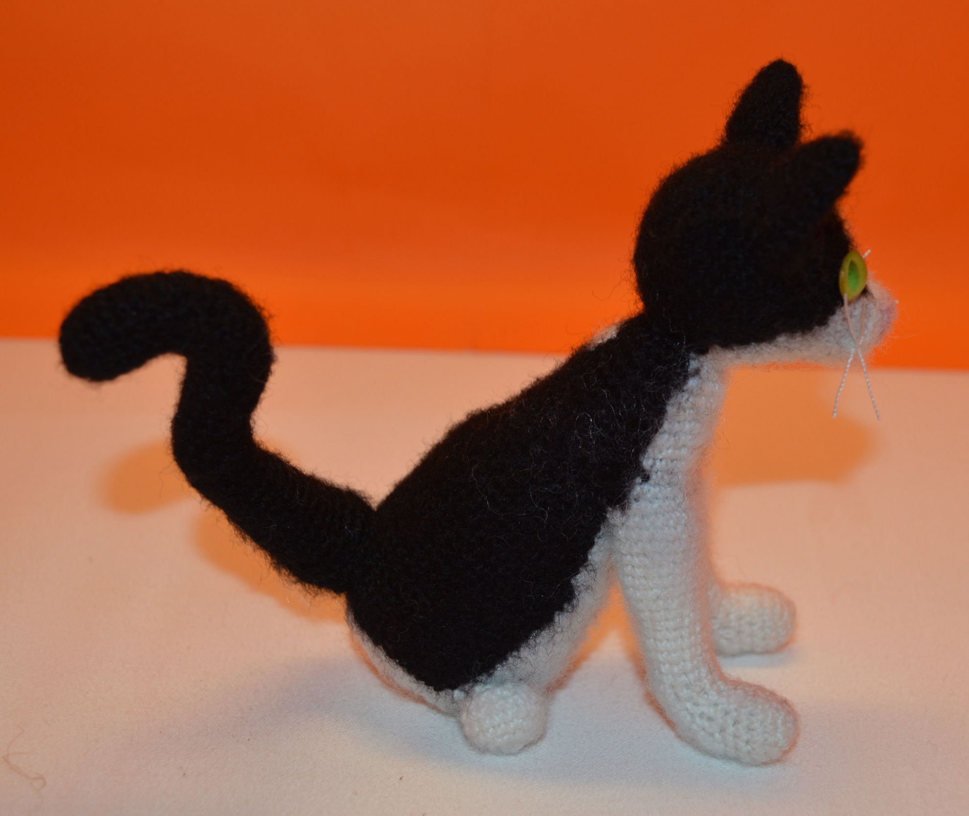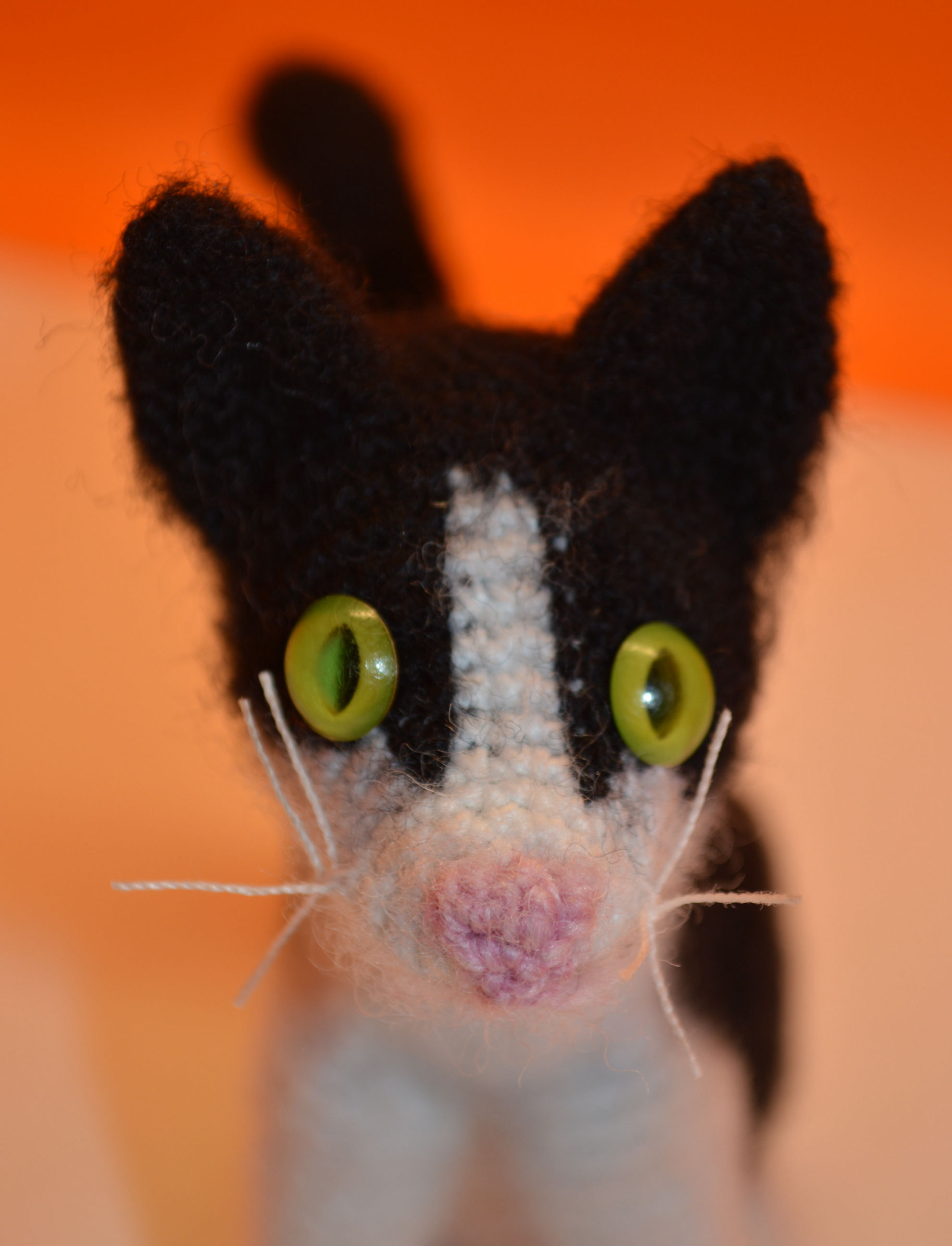 Material: Wolle Schwarz, Weiss, Rosa, Plastik Katzenaugen,                          Bastelwatte,